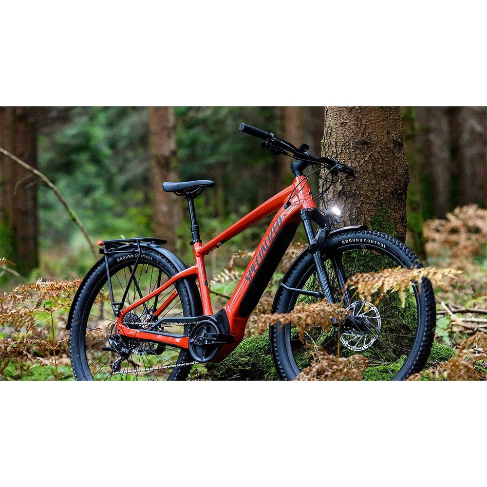 - Integroidut valot saavat virtansa pyörän sisäisestä järjestelmästä, eivätkä ne vaadi akkuja tai latausta. Ajovalo on Lezyne E-Bike Mini STVZO E65 (210 – Lumen, 12V) ja takavalo on Spanninga Commuter Glow XE (12V).